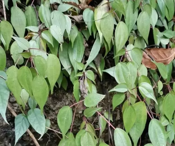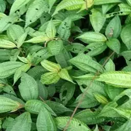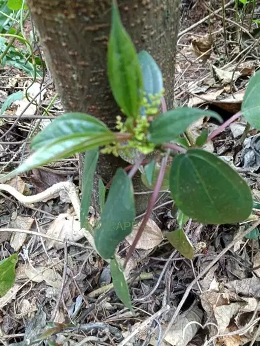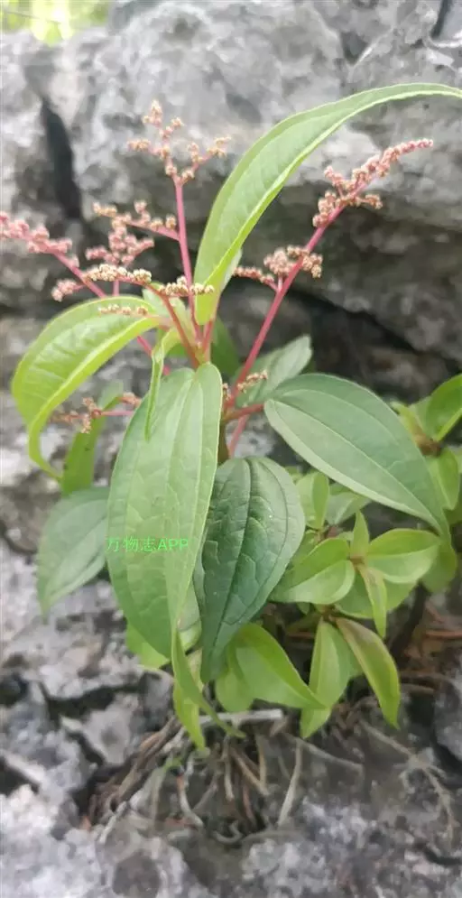 茎肉质,高10- 70厘米,粗1.5-5毫米,基部常多少木质化,干时带蓝绿色,常被灰白色腊质,下部裸露,节间距0.5-3厘米,分枝或几无分枝。叶薄纸质或近膜质,同对的不等大或近等大,形状大小变异很大,卵形、卵状披针形、椭圆状披针形,卵状或倒卵状长圆形,长1-15 厘米,宽0.6-5厘米,先端尾状渐尖或长尾状渐尖,基部常偏斜,圆形、浅心形或心形,有时变狭近楔形,边缘稍厚,全缘,有时波状,干后上面暗绿色或蓝绿色,下面淡绿色,常呈细蜂窠状,疏生腺点,钟乳体梭形,长0.3-0.4毫米,在上面明显,基出脉3(- 5)条,其侧出的一对弧曲,伸达近先端网结或消失,侧脉多数,常不规则地结成网脉,外向的二级脉在远离边缘处彼此网结,有时二级脉不明显;叶柄长。0.5-7厘米;托叶很小,三角形,长约1-2毫米,渐脱落。