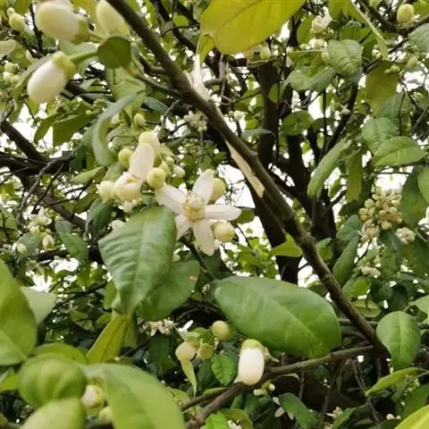 柚的结果枝多为花序果枝,即有叶花序果枝和无叶花序果枝两种类型。有叶花序果枝为带叶的结果枝,除顶端有花外,其他各叶腋也多着生花蕾,或在新梢顶端抽生一总状花序,有叶花序果枝花数4-8朵不等。无叶花序果枝上无叶或仅有1-2片极小叶片,枝上着生3-45朵花不等。
