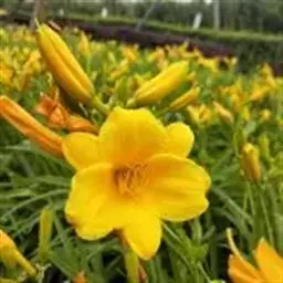 金娃娃萱草:是萱草的人工栽培的园艺品种。地下具根状茎和肉质肥大的纺锤状块根。叶基生,条形,排成两列,…