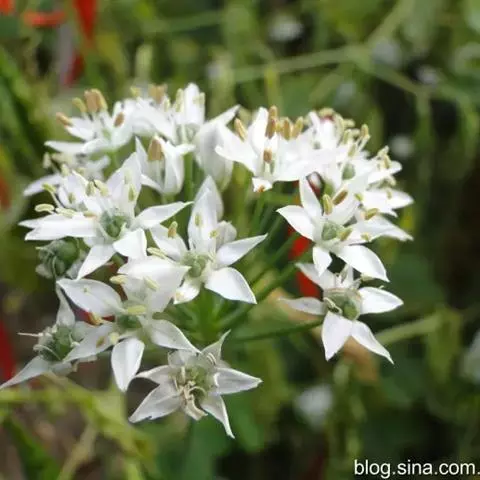 花:锥型总苞包被的伞形花序,内有小花20-30朵。小花为两性花,花冠白色 ,花被片6片,雄蕊6枚。子房上位,异花授粉。