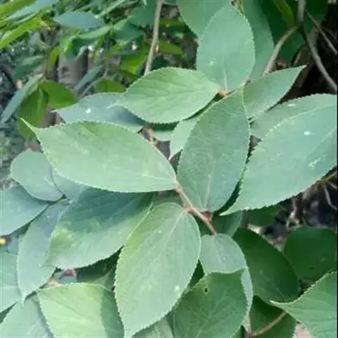 叶片多破碎、皱缩,完整者展平后为卵形或卵状椭圆形,长3.5-8cm,宽2-3.5cm,先端渐尖,基部宽楔形,两边不相等,中上部边缘有锯齿,稀全缘;上表面暗黄绿色,较粗糙,下表面黄绿色;幼叶两面被散生毛,脉上的毛较多,脉腋毛较密,老叶无毛;叶柄长3-7mm,具细软毛。质脆,易碎。气微,味淡。