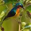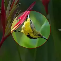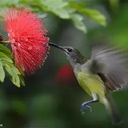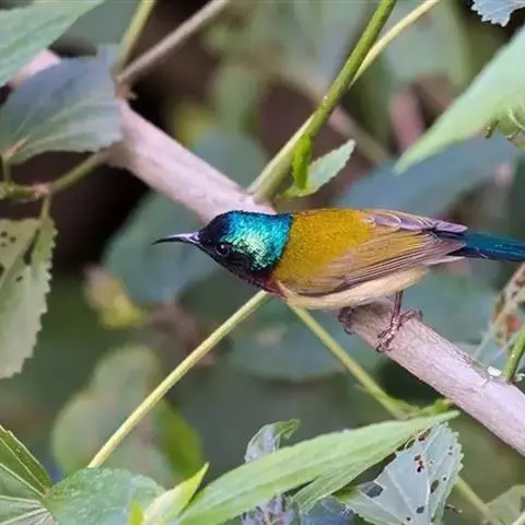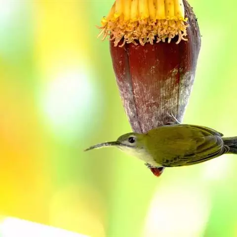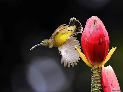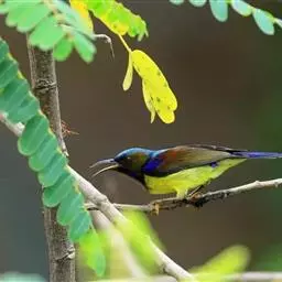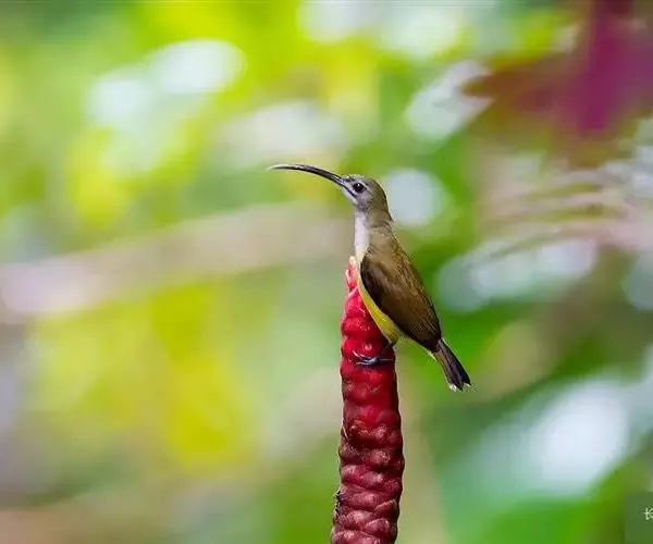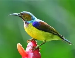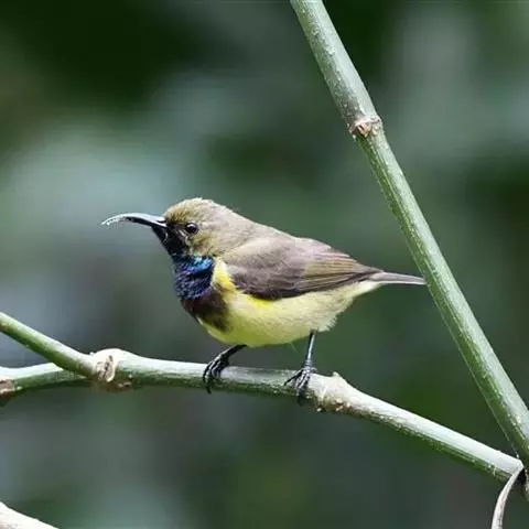 叉尾太阳鸟,雀形目太阳鸟科太阳鸟属留鸟;为小型鸟类,雄鸟头顶辉蓝绿色,上体橄榄绿色,腰明黄色,…