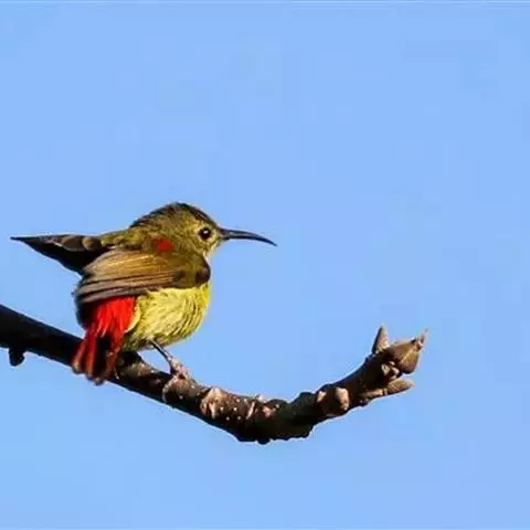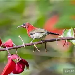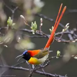 火尾太阳鸟为太阳鸟科太阳鸟属的鸟类。体长20厘米,色彩艳丽。雄鸟红色,具形长的艳猩红色中央尾羽。…