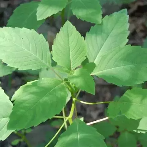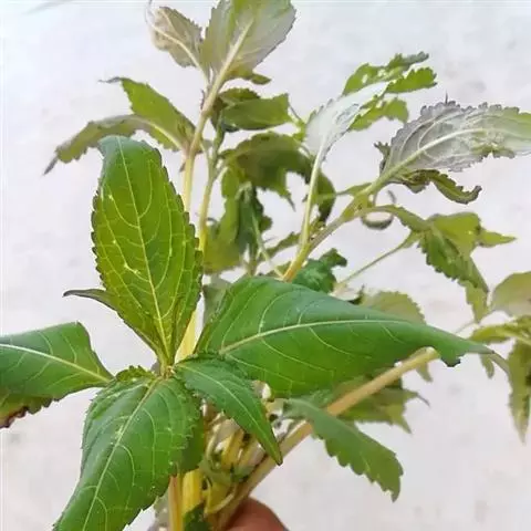 叶常密集茎上部,互生,具柄;叶片膜质,长圆状卵形或披针形,长7-11厘米,宽2.5-4.5厘米,顶端渐尖,基部楔状狭成长1-3.5厘米的叶柄,具指状托叶腺,边缘具圆齿状齿,齿间具小尖,上面深绿色,被白色疏生伏毛,下面淡绿色,无毛,侧脉5-6对,弧状弯,向基部具少数腺体。