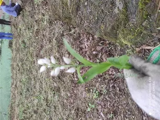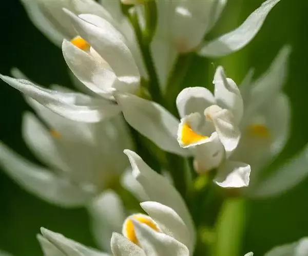 总状花序长1.5-6厘米,具2-13朵花;花苞片线状披针形至狭三角形,长2-6毫米,但最下面1-2枚叶状,长可达5-13厘米;花白色,稍开放或不开放;萼片狭菱状椭圆形或狭椭圆状披针形,长1.1-1.6厘米,宽3.5-4.5毫米,先端渐尖或近急尖,具5脉;花瓣近倒卵形,长7-8毫米,宽约4毫米,先端急尖或具短尖;唇瓣长5-6毫米,3裂,基部具囊;侧裂片近卵状三角形,多少围抱蕊柱;中裂片三角状心形,长3-3.5毫米,宽5-6毫米,上面具3-4条纵褶片,近顶端处密生乳突;唇瓣基部的囊短而钝,包藏于侧萼片基部之内;蕊柱长4-5毫米。