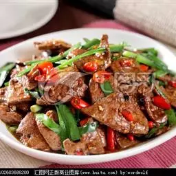 2、烹制:热锅放油,放入姜丝爆香,加朝天椒炸出红色的辣椒油后加入泡椒和蒜片,再放猪肝,爆炒加盐,鸡精出锅就可以了。