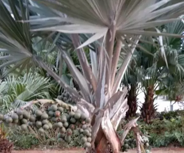 霸王棕的果实为核果,其种子个体较大,单粒种子重达14-17克,具有坚厚的种壳。种子基部有3孔,其中,l孔与胚相对,萌动时胚根由此穿出,其余2孔为假孔。果腔内胚乳含有丰富的营养物质,供种子萌发时吸收。