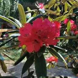问客杜鹃:灌木,高1-3米。幼枝细长,密被腺体状鳞片。叶革质,椭圆形,卵状披针形或长圆形,上面被鳞…