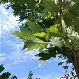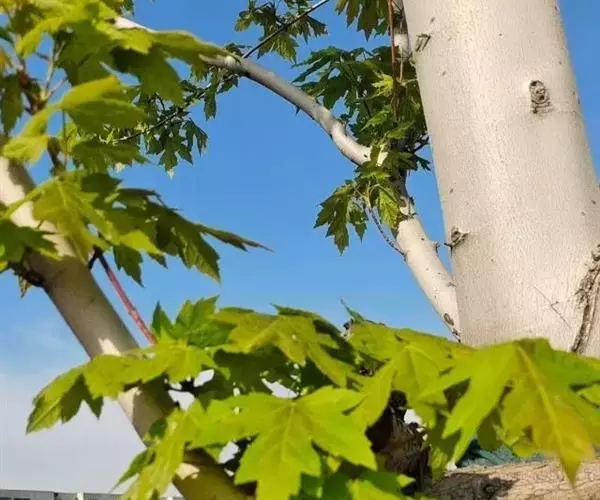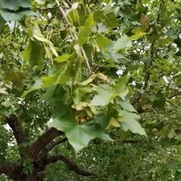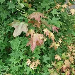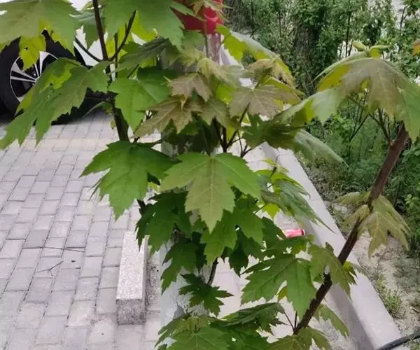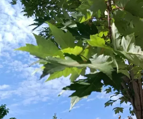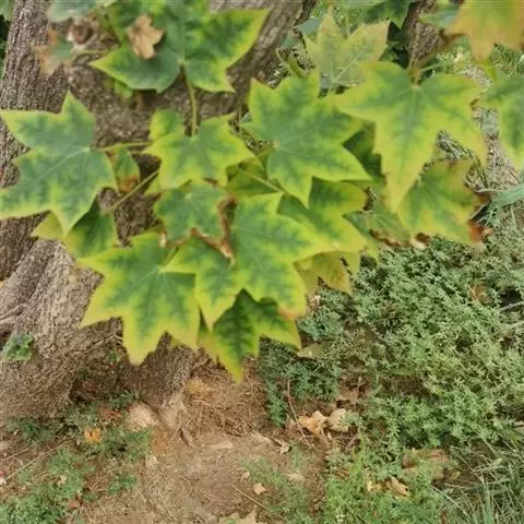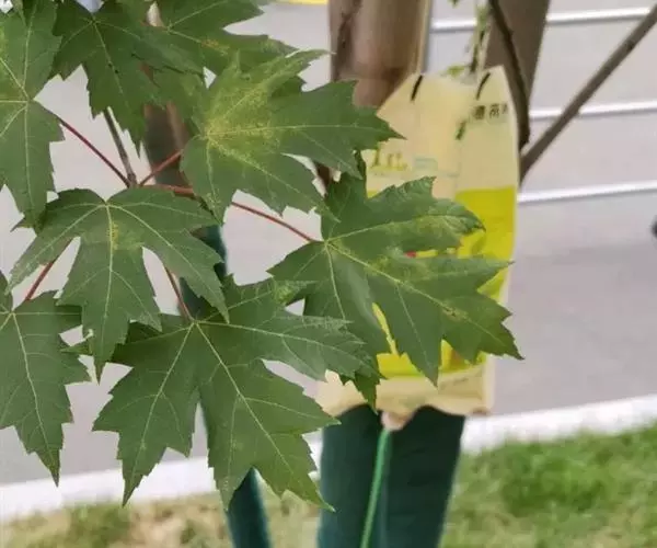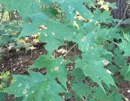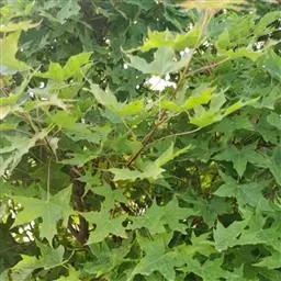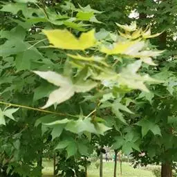 4. 叶斑病:该病害主要危害糖槭叶片。 初期多在叶基部或叶脉基部形成小斑,以后逐渐扩大成不规则斑,病斑大小不等。 病斑退绿失水后,变成黄白色,象薄纸一样;叶片有的是在病斑穿孔后脱落,有的是在病斑不大时即脱落。 前些年,糖槭叶斑病在哈尔滨市区的发生比较严重,在7~8月份有大量叶片枯黄脱落,严重时树上绿叶所剩无几,呈枯树状。 目前,杀菌剂可杀得、百菌清、甲基托布津和退菌特等对糖槭叶斑病分生孢子的萌发有极好的抑制作用。 建议在5月初至7月初,视降雨情况,施药3~ 4次。