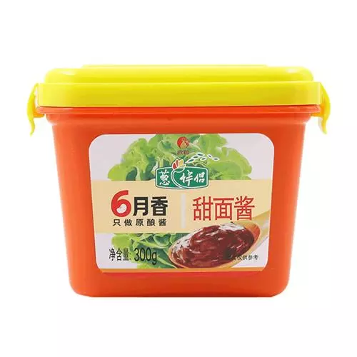 甜面酱,又称甜酱,是以面粉为主要原料,经制曲和保温发酵制成的一种酱状调味品。其味甜中带咸,同时有酱香和酯香,适用于烹饪酱爆和酱烧菜,如“酱爆肉丁”等,还可蘸食大葱、黄瓜、烤鸭等菜品。