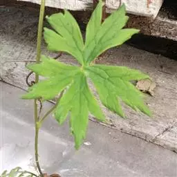 茎缠绕,无毛,常带紫色,稀疏地生叶,分枝。茎中部叶的叶片五角形或卵状五角形,长6.5-12厘米,宽8-13厘米,基部心形,三深裂至距基部0.9-3.2厘米处,中央深裂片梯状菱形或卵状菱形,短渐尖,不明显三浅裂,浅裂片具少数小裂片或卵形粗牙齿,侧深裂片斜扇形,不等二浅裂;叶柄比叶片稍短,疏被短柔毛或几无毛。