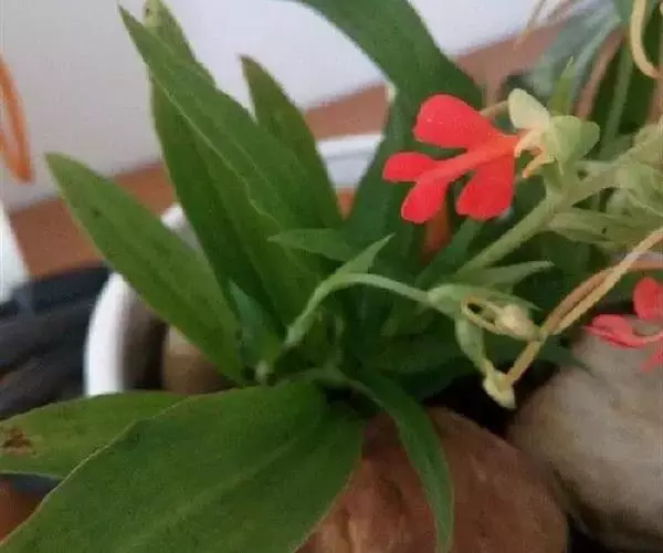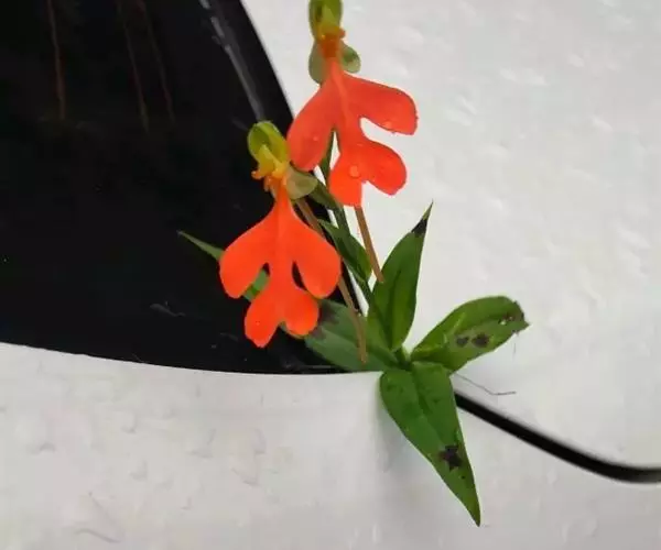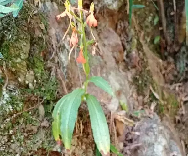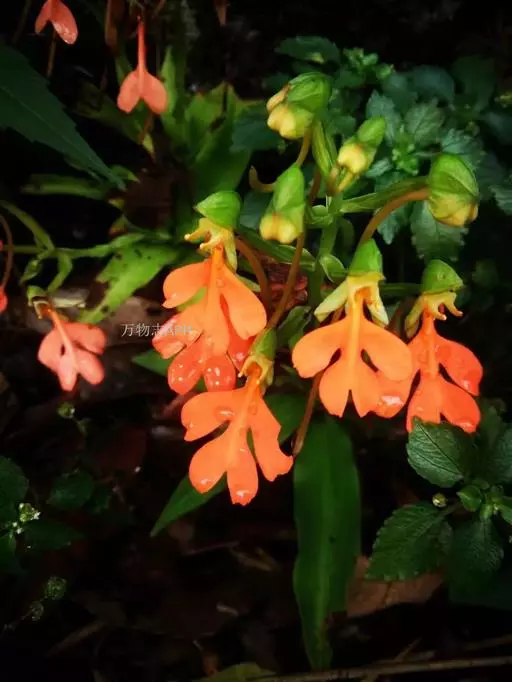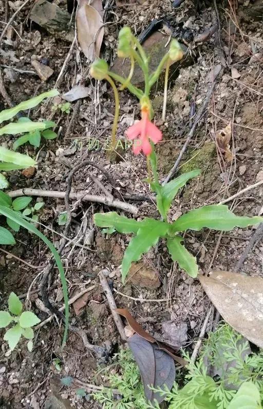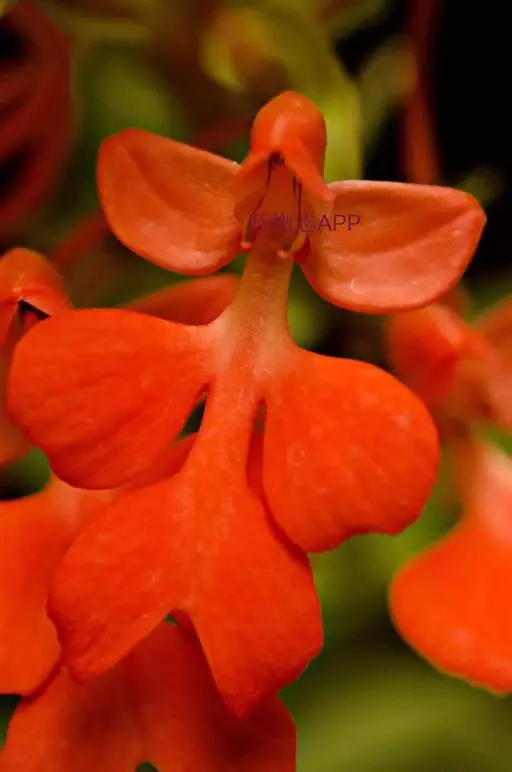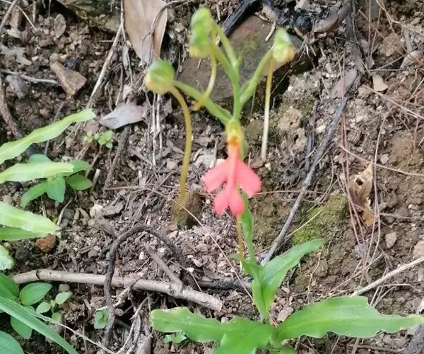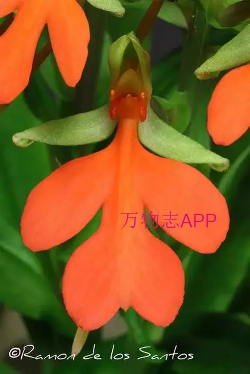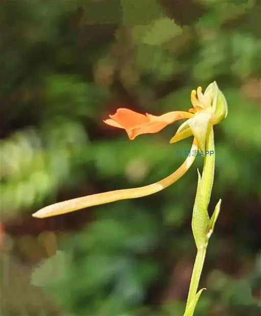 总状花序具2-10余朵疏生的花,长3-8厘米,花茎无毛;花苞片卵状披针形,长1.5-1.7厘米,先端渐尖,短于子房;子房圆柱形,扭转,无毛,连花梗长2-3厘米;花中等大,萼片和花瓣绿色,唇瓣橙黄色、橙红色或红色;中萼片直立,近圆形,凹陷,长约9毫米,宽约8毫米,先端钝,具3脉,与花瓣靠合呈兜状;侧萼片长圆形,长9-10毫米,宽约5毫米,反折,先端钝,具5脉;花瓣直立,匙状线形,长约8毫米,宽约2毫米,先端钝,具1脉;唇瓣向前伸展,轮廓卵形,长1.8-2厘米,最宽处约1.5厘米,4裂,基部具短爪,侧裂片长圆形,长约7毫米,宽约5毫米,先端钝,开展;中裂片2裂,裂片近半卵形,长约4毫米,宽约3毫米,先端为斜截形;距细圆筒状,污黄色,下垂,长2-3厘米,直径约1毫米,末端通常向上弯;蕊喙大,三角形,具延长的臂;柱头2个,隆起,棒状,稍弯曲,长约2.5毫米。