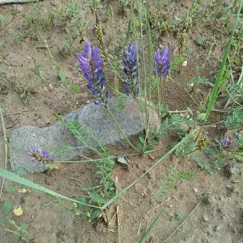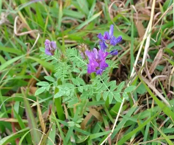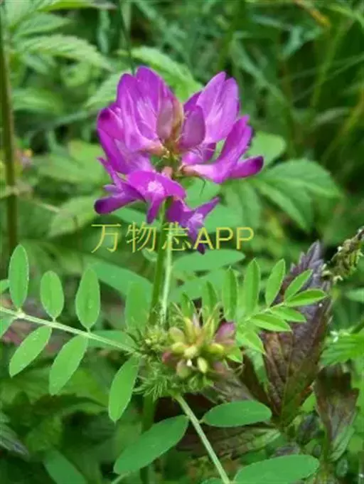 一年生或二年生草本,被开展、白色柔毛。茎直立,高达80厘米,分枝,有细棱。羽状复叶有11-19(23)片小叶,长4-8厘米;叶柄长不及1厘米;托叶分离,狭披针形或钻形,长4-8毫米;小叶长圆形、倒卵状长圆形或长圆状椭圆形,长5-20毫米,宽2-6毫米,先端圆或略尖,基部钝或近楔形,小叶柄长不及1毫米。总状花序较密,生10-20花,长3.5-10厘米;总花梗长2-5厘米;苞片线形或刚毛状,长3-4.5毫米。花梗长1-1.5毫米;花萼斜钟状,长5-5.5毫米,萼筒长1.5-2毫米,萼齿线形或刚毛状,上边2齿较萼部短,下边3齿较长(长达4毫米);花冠紫色,旗瓣近倒卵形,长12-14毫米,宽6-8毫米,先端微缺,基部宽楔形,翼瓣长约10毫米,瓣片弯长圆形,长约7毫米,宽1-1.4毫米,先端钝,基部耳向外伸,瓣柄长约3毫米,龙骨瓣长约13毫米,瓣片近倒卵形,长8-9毫米,宽2-2.5毫米,瓣柄长约4.5毫米;子房有柄,被毛,柄长约1.5毫米。荚果线形,长1.5-2.5厘米,宽2-2.5毫米,先端凸尖喙状,直立,内弯,具横脉,假2室,含20-30颖种子,果颈短,长1.5-2毫米。种子淡褐色或褐色,肾形,长约1毫米,宽约1.5毫米,有斑点,平滑。花期7-9月,果期8-10月。