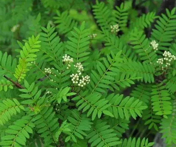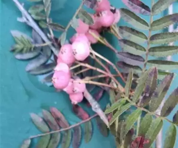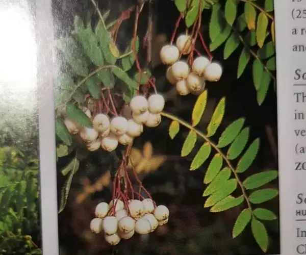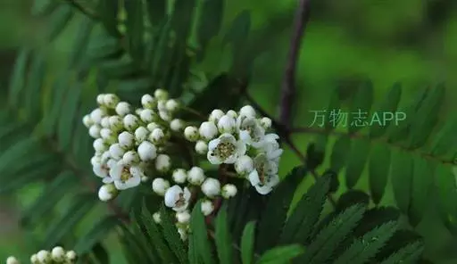 观叶观花观果落叶灌木或小乔木,高达5米,小枝红褐色至灰黑色。冬芽长卵形,外被柔毛。羽状复叶,小叶17~25个,连柄长10~14厘米,小叶近无柄,长圆形至长圆披针形,长1.3~3厘米,宽0.4~1厘米,先端渐尖或钝圆,基部斜楔形,每侧有9~14齿,表面无毛,背面灰绿色,叶轴上有浅沟,两侧有窄翅。叶柄长1~2厘米,托叶圆卵形,早落。复伞房花序,直径4~8厘米,花多数,花直径8~10毫米,萼被疏毛,花瓣卵圆形,4毫米,白色。雄蕊20枚,长为花瓣的1/3,花药褐色,花柱5个,基部具柔毛,与雄蕊等长。果球形,白色,直径6~8毫米,萼片微闭合。