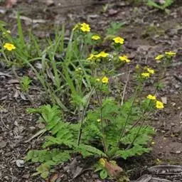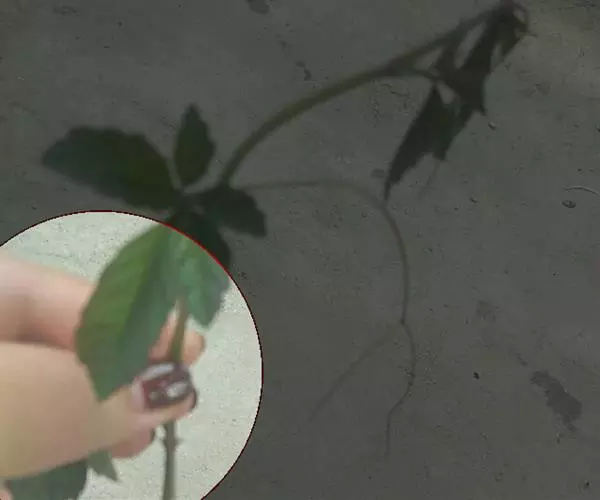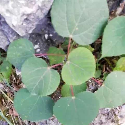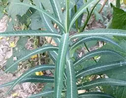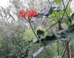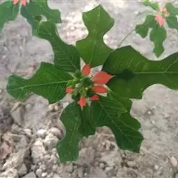 直直立灌木,株高1.5米左右,长块根,根部肉质。叶掌状3~7深裂,裂片披针形,全缘,裂片中央有不规则 的黄色斑块。叶面绿色,叶柄红色,花序腋生,有花数朵.