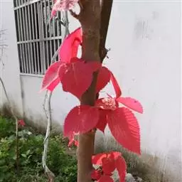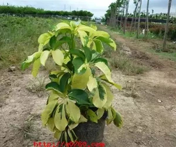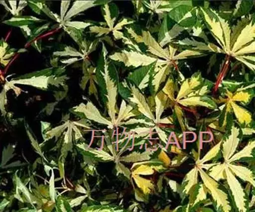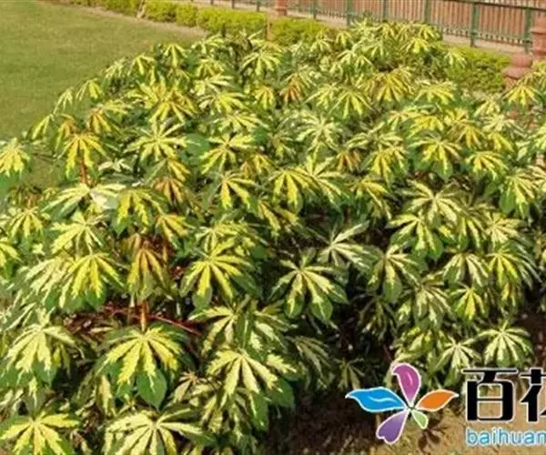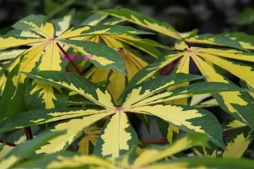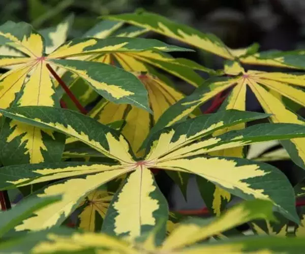 花叶木薯叶片掌状深裂,绿色叶面镶嵌黄色斑块,红色叶柄,显得十分绚丽,是非常耐看的观叶植物。