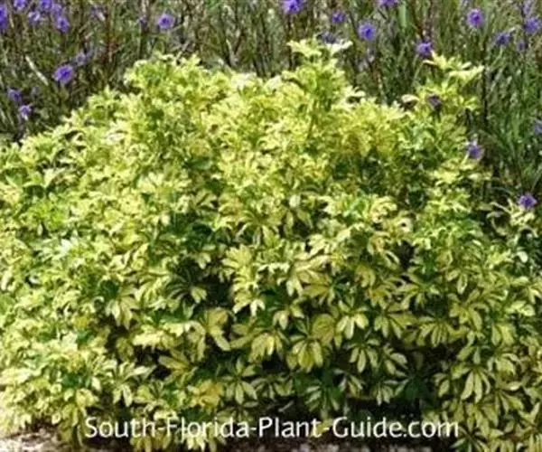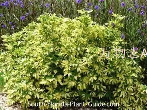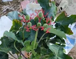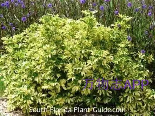 立灌木,株高1.5米左右,长块根,根部肉质。叶掌状3~7深裂,裂片披针形,全缘,裂片中央有不规则的黄色斑块。叶面绿色,叶柄红色,花序腋生,有花数朵.