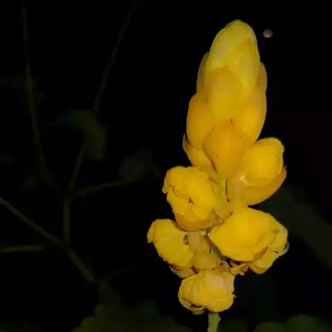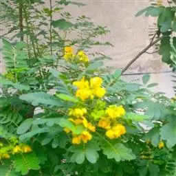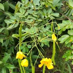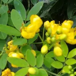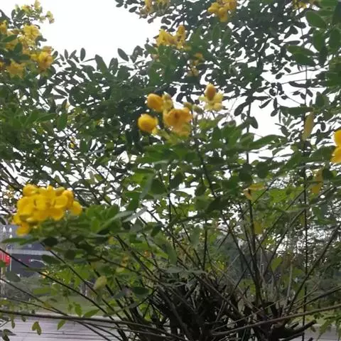 黄槐 灌木或小乔木,高5-7米;分枝多,小枝有肋条;树皮颇光滑,灰褐色;嫩枝、叶轴、叶柄被微柔毛。