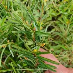 叶长10-15厘米;叶轴及叶柄呈扁四方形,在叶轴上面最下2或3对小叶之间和叶柄上部有棍棒状腺体2-3枚;小叶7-9对,长椭圆形或卵形,长2-5厘米,宽1-1.5厘米,下面粉白色,被疏散、紧贴的长柔毛,边全缘;小叶柄长1-1.5毫米,被柔毛;托叶线形,弯曲,长约1厘米,早落。