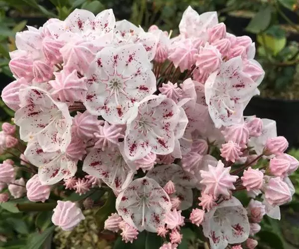 山月桂(Kalmia latifolia L.)为杜鹃花科山月桂属常绿灌木或小乔木,原产美国东部。叶革质,浅绿至深绿色。伞房花序顶生。常见的花色为浅粉色近白色,其余有纯白色、深粉红、大红色、肉桂色和紫色,部分品种花冠内部有栗色环带。以上特点使山月桂具有很高的观赏价值,被美国康涅狄克州选为州花。
