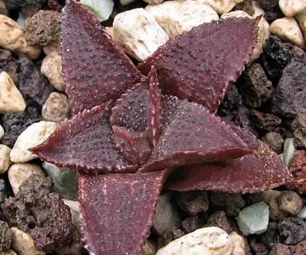 肉质叶排列成莲座状,无茎,株幅6-10cm,具叶10-15片。叶5cm,基部宽2-2.8cm,阔卵状三角形,叶端具小尖,外弯伸展,肉质,坚硬,暗绿色,背面稍红。叶面扁平,无毛,透明,具5-7条纵线及短横线,组成方格斑纹。叶背有排列不规则的小的色疣状突起,叶缘具细白齿 。