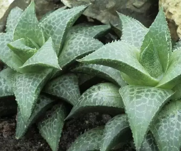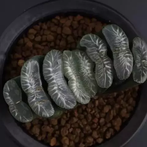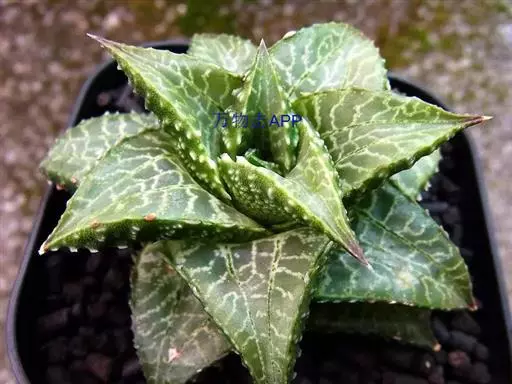 植株无茎,肉质叶呈螺旋状放射生长,排成莲座状,叶质肥厚而坚硬,卵圆状三角形,顶端渐尖,叶色暗绿,叶背稍呈红褐色,并有不规则排列的白色小疣突,叶缘向内卷,并具白色小齿,叶面平展,无毛,呈透明或半透明状,叶脉由数条白绿色纵线及短横线组成,将叶面分割成蛇皮样网格状斑纹。