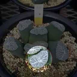 软叶系多肉植物。短茎,底部呈莲座状生长,叶片短小肥厚,呈三角状,叶色深绿,叶缘有小锯齿,叶片上的淡绿色窗形纹路为其一大特色。叶片的“窗”构造,主要帮助植株透光,以利于进行光合作用。花梗细长柔软,可适度遮风,避免花梗凋萎。花朵为白色 。