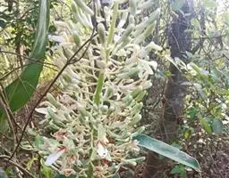 花冠、退化雄蕊杏黄色与正种不同。花序单生而疏松,着花少,苞片极少,花大而柔软,向下反曲,下部呈筒状,淡黄色,唇瓣圆形。