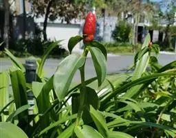 美人蕉(学名:Canna indica L.):多年生草本植物,高可达1.5米,全株绿色无毛,被蜡质白粉。具块状根茎。地上枝丛生。单叶互生;具鞘状的叶柄;叶片卵状长圆形。总状花序,花单生或对生;萼片3,绿白色,先端带红色;花冠大多红色,外轮退化雄蕊2-3枚,鲜红色;唇瓣披针形,弯曲;蒴果,长卵形,绿色,花、果期3-12月。