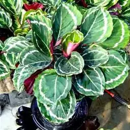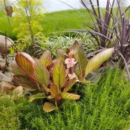 花红色,单生;苞片卵形,绿色,长约1.2厘米;萼片3,披针形,长约1厘米,绿色而有时染红;花冠管长不及1厘米,花冠裂片披针形,长3-3.5厘米,绿色或红色;外轮退化雄蕊3-2枚,鲜红色。该种花较小,主要赏叶。