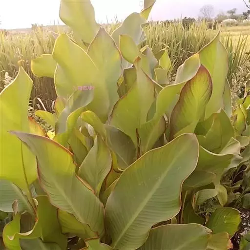 金脉美人蕉叶片淡黄色,叶脉绿化,叶缘具红边,全缘,大花美人蕉之变种