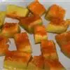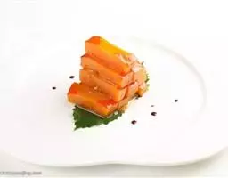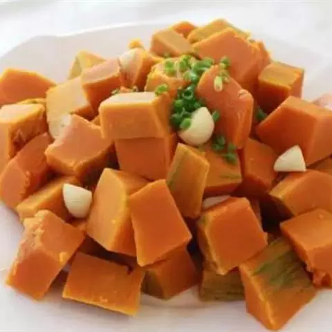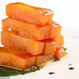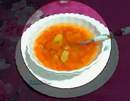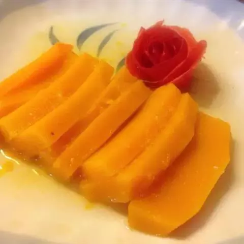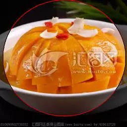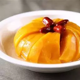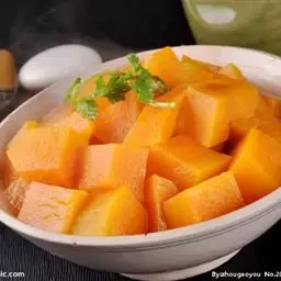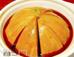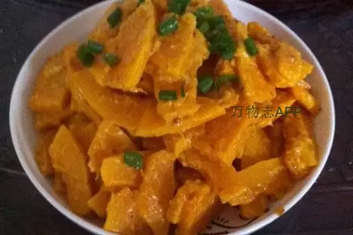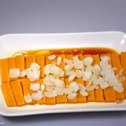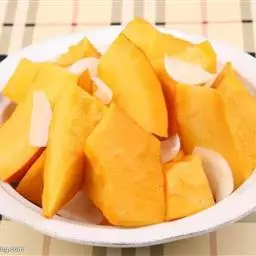 一南瓜切成五六厘米的薄片,放在微波炉内高火,时间视南瓜的多少而定,直到南瓜八九分熟