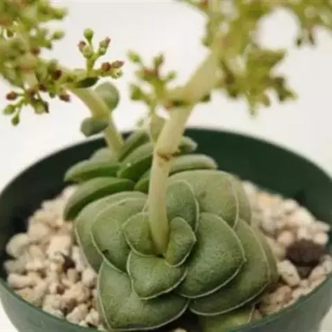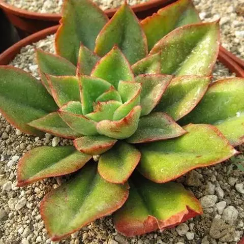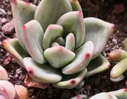 小红衣是景天科、拟石莲花属的一种多肉植物。叶片匙形,扁平细长,叶表具白粉,有明显的半透明边缘,…