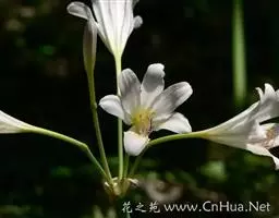 长筒石蒜草本,地生。鳞茎卵球形;叶披针形;伞形花序,有花5-7朵,花白色;花被裂片腹面稍有淡红色条纹,…
