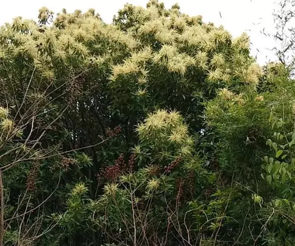 雄穗状花序或圆锥花序花序轴无毛,花被裂片内面被短柔毛;雌花序生于当年生枝的顶部,每壳斗有雌花一朵,花柱3或4枚,有时2枚,长达1.5毫米。果序长8-15厘米;壳斗圆球形,连刺径25-3.5毫米,通常整齐的3-5 瓣开裂,刺长6-12毫米,在下部或近中部合生成刺束,几将壳斗外壁完全遮蔽,很少因刺疏且短致壳壁明显可见,初时密被灰棕色短伏毛,透熟时几无毛,内壁密被棕色长绒毛;坚果圆锥形,高12-16毫米,横径10-13毫米,无毛,或在顶部有稀疏伏毛,果脐在坚果底部。花期5-7月,果次年9-11月成熟。