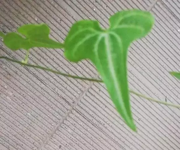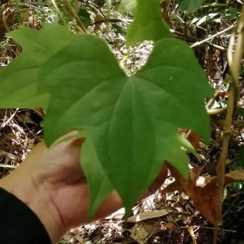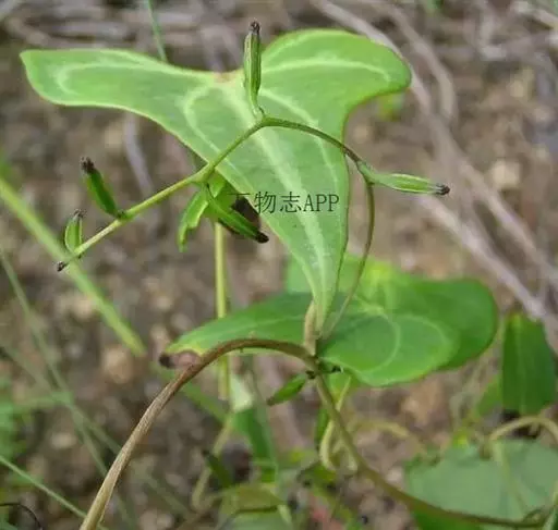 缠绕草质藤本。根状茎横生,近圆柱形,指状或不规则分枝,新鲜时外皮棕褐色,断面黄色,干后除去须根常留有白色点状痕迹。茎左旋,光滑无毛,有时在分枝或叶柄基部两侧微突起或有刺。单叶互生;叶片厚纸质,三角状卵形、心形或箭形,通常3浅裂至3深裂,中间裂片三角状卵形或披针形,两侧裂片圆耳状或长圆形,两面光滑无毛,表面绿色,常有不规则斑块,干时呈灰褐色;叶柄盾状着生。