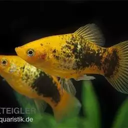 剑尾鱼 剑尾鱼剑鱼6~8月龄性成熟,雌雄鱼很容易识别,雌鱼除无剑尾外较雄体略为肥大;雄鱼各鳍较尖,臀鳍前部分鳍条演化成输精器。成熟亲鱼在适温时期,每隔4~5周繁殖一次,每次产仔鱼20~30尾,多的近百尾,适宜繁殖的水质硬度6~9度、pH7~7.2。