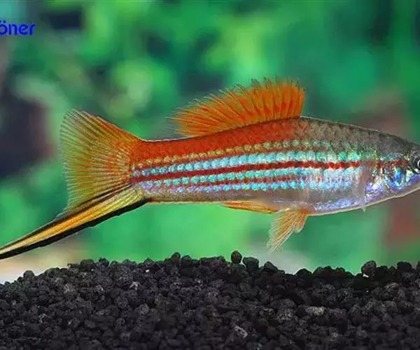 成鱼体长可达10厘米,通体橄榄色,鳞片边缘褐色,两侧中部有一条深红色条纹,从鳃后直至尾部,条纹上下有浅蓝色镶边。雄鱼尾鳍下端延长似剑,其长度超过体长,剑尾绿色或橙色,边缘黑色,背鳍上有红斑。雌鱼色泽较雄鱼逊色,无剑尾。
