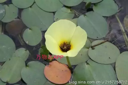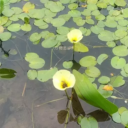 株高5cm,茎圆柱形。根自水中茎节处发出。叶簇生于茎上,叶片呈卵形至近圆形,具长柄,长4~8cm,宽3~6cm,顶端圆钝,基部心形,全缘。叶柄圆柱形,长度随水深而异,有横隔。伞形花序,小花具长柄,罂粟状,花黄色;蒴果披针形。种子细小,多数,马蹄形。花期6~9月。