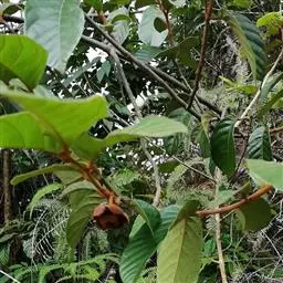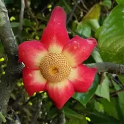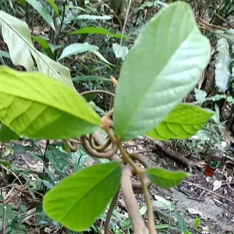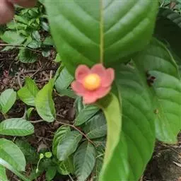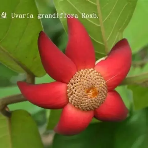 华南植物园繁育中心种植着一种花艳果奇的植物—大花紫玉盘(Uvaria grandiflora Roxb.)。该植物又名山椒子、川血乌、红肉梨,为番荔枝科攀援灌木。