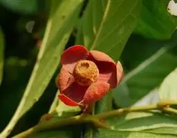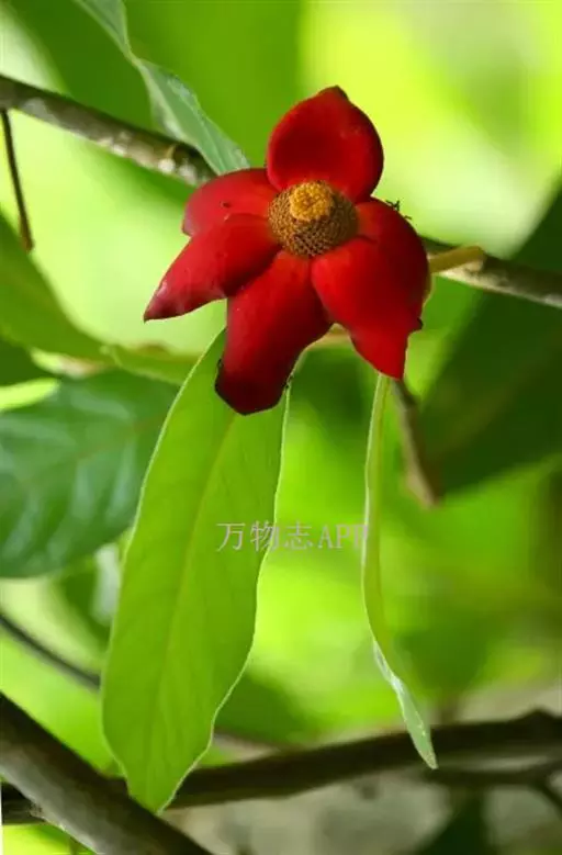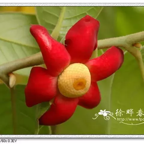 全株密被黄褐色绒毛,叶互生,长倒卵形;花较大,6玫花瓣排列成2轮,紫红色或深红色,数量众多的雄蕊、雌蕊聚生于花瓣中间,宛若紫色玉盘上盛放着的黄色水晶。花虽藏于叶背开放,却难掩其艳丽的姿容,常于万绿丛中透出点点惹眼的红色,若是凑近细闻,更有淡淡的芳香。花后结果,果光滑,长圆柱状,酷似辣椒,聚生于“果盘”上,果实向四面八方伸展,到成熟时分变成橙黄色,齐指向地面,甚是诱人。