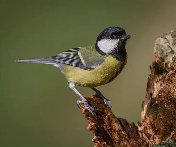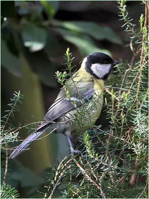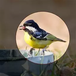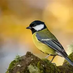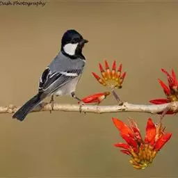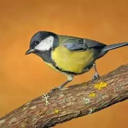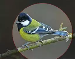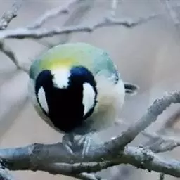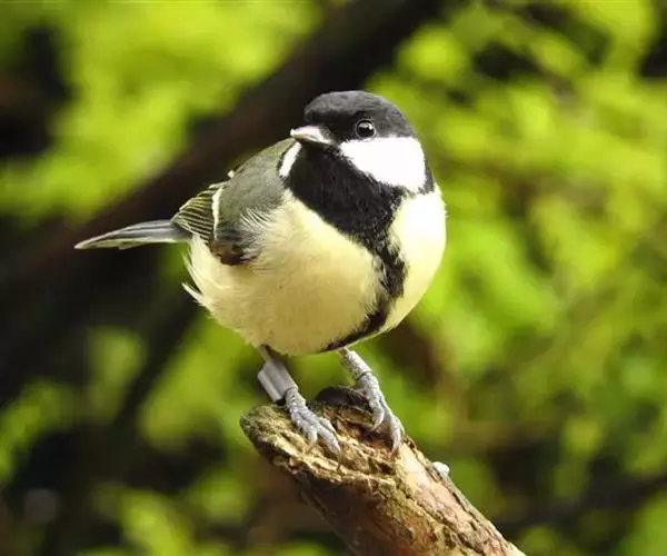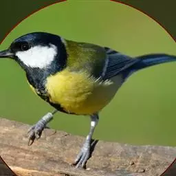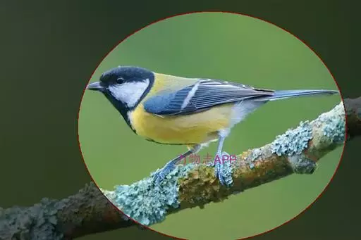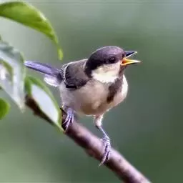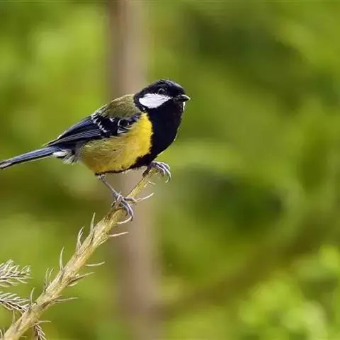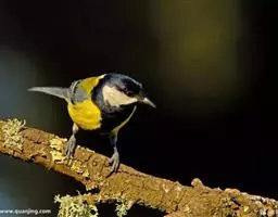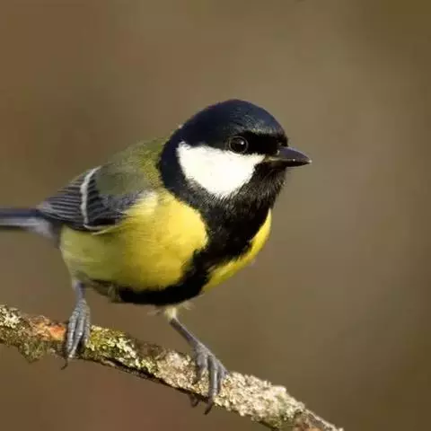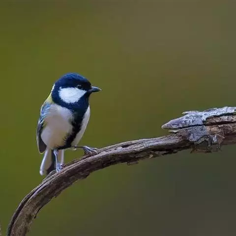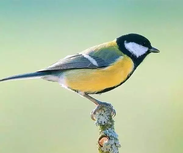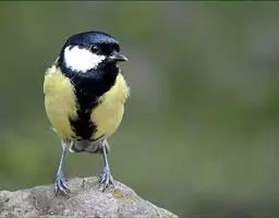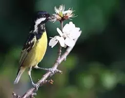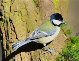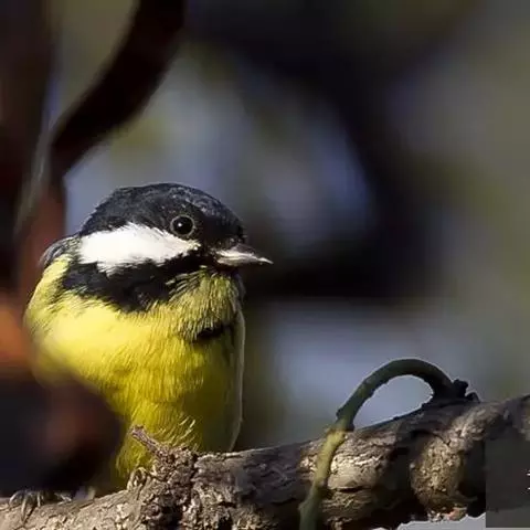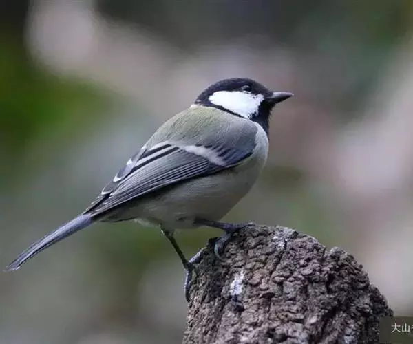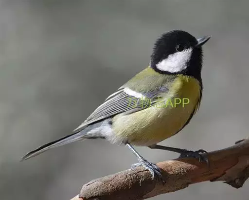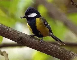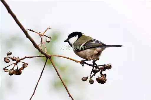 大山雀(学名:Parus major):中小型鸟类,体长13-15厘米。整个头呈黑色,头两侧各有一大型白斑,喙呈尖细状,便于捕食。上体为蓝灰色,背沾绿色。下体白色,胸、腹有一条宽阔的中央纵纹与颏、喉黑色相连。