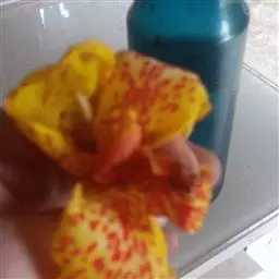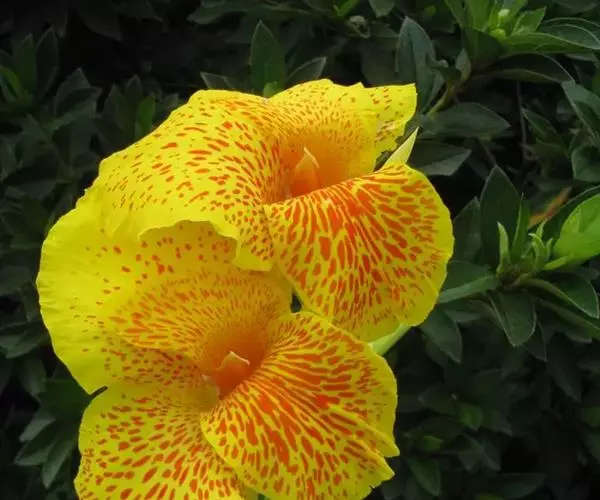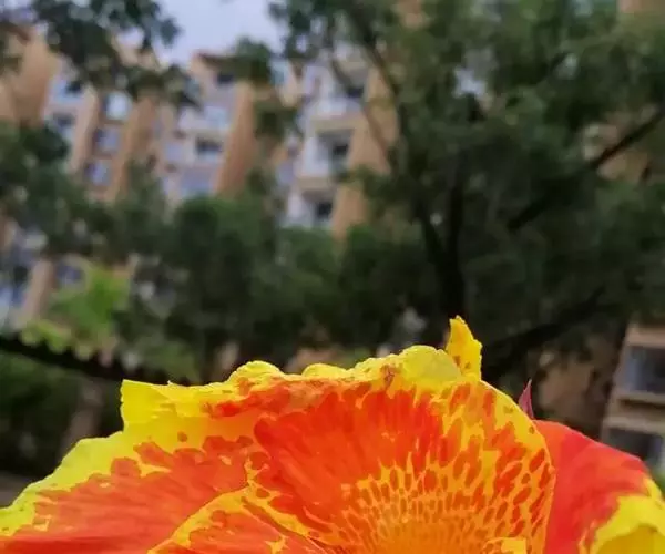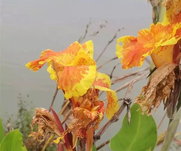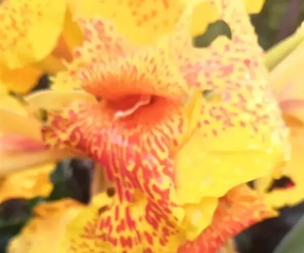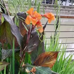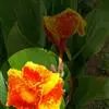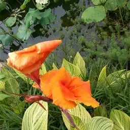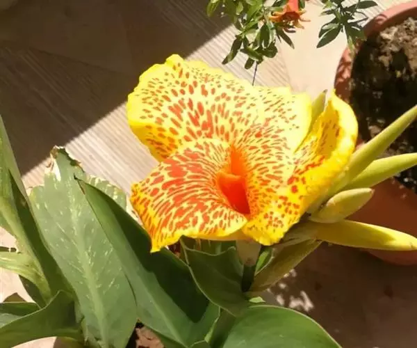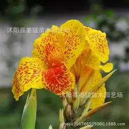 兰花美人蕉(学名:Canna orchioides Bailey):是多年生球根草本植物。株高1-1.5米;茎绿色。叶片椭圆形至椭圆状披针形。总状花序通常不分枝;花大,直径10-15厘米;花冠裂片披针形,鲜黄至深红,具红色条纹或溅点,无纯白或粉红色;花期:夏、秋。为园庭观赏植物。