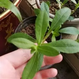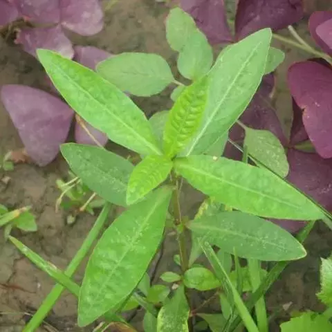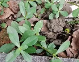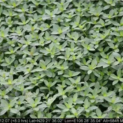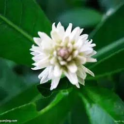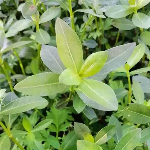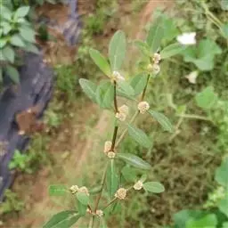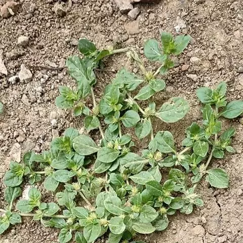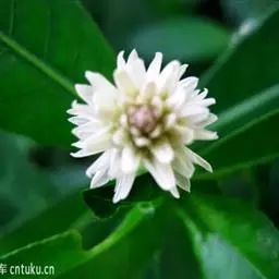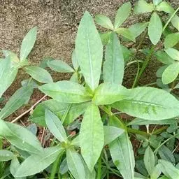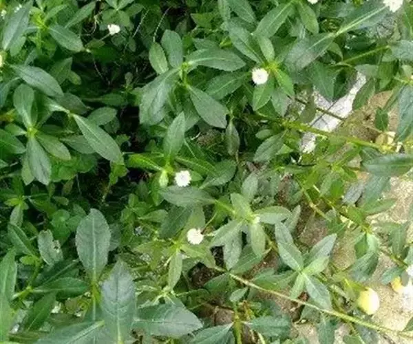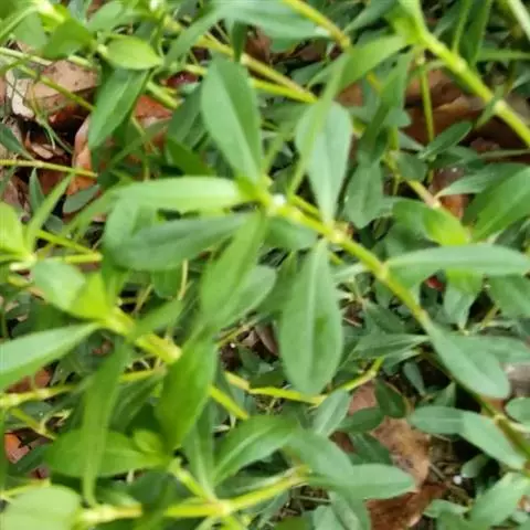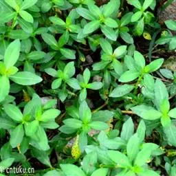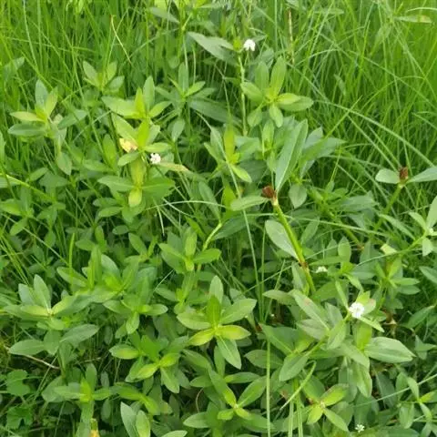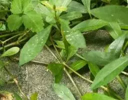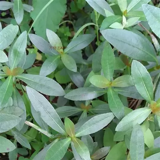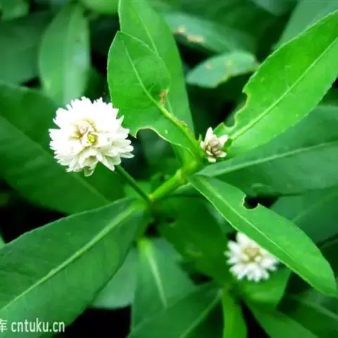 喜旱莲子草 多年生草本;茎基部匍匐,上部上升,管状,不明显4棱,长55-120厘米,具分枝,幼茎及叶腋有白色或锈色柔毛,茎老时无毛,仅在两侧纵沟内保留。叶片矩圆形、矩圆状倒卵形或倒卵状披针形,长2.5-5厘米,宽7-20毫米,顶端急尖或圆钝,具短尖,基部渐狭,全缘,两面无毛或上面有贴生毛及缘毛,下面有颗粒状突起;叶柄长3-10毫米,无毛或微有柔毛。