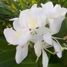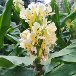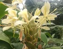 姜花象征纯朴。它一枝挺拔,一个花苞开出五、六朵洁白泛黄的花儿,每朵有三片花瓣,宛如翩翩白蝶,聚集于翡翠簪头,从朝到暮,喷放清香。故欧美把姜花称作“蝴蝶百合”。