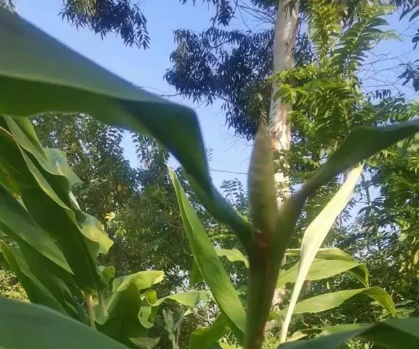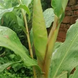茎高1-2米。叶片长圆状披针形或披针形,长20-40厘米,宽4.5-8厘米,顶端长渐尖,基部急尖,叶面光滑,叶背被短柔毛;无柄;叶舌薄膜质,长2-3厘米。