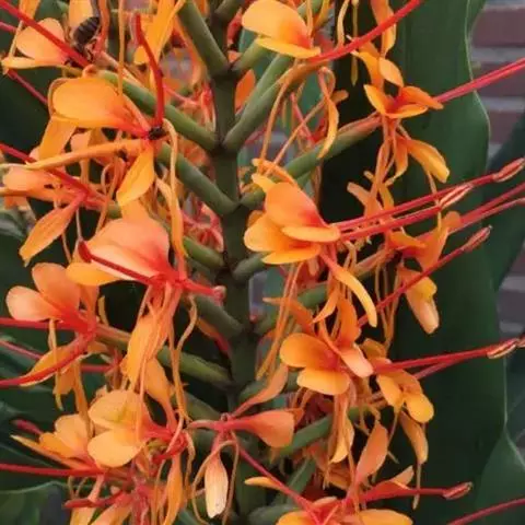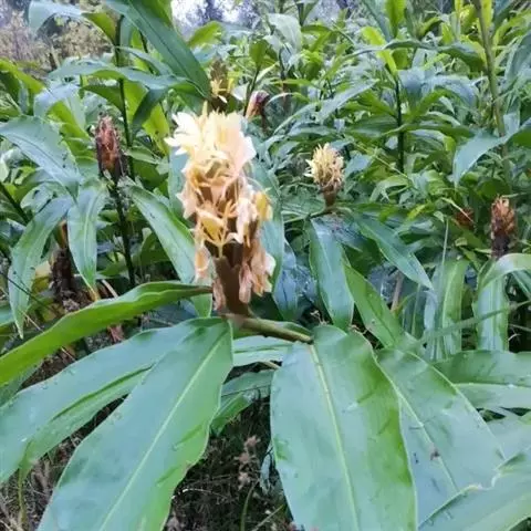 穗状花序顶生,椭圆形,长10-20厘米,宽4-8厘米;苞片呈覆瓦状排列,卵圆形,长4.5-5厘米,宽2.5-4厘米,每一苞片内有花2-3朵;花芬芳,白色,花萼管长约4厘米,顶端一侧开裂;花冠管纤细,长8厘米,裂片披针形,长约5厘米,后方的1枚呈兜状,顶端具小尖头;侧生退化雄蕊长圆状披针形,长约5厘米;唇瓣倒心形,长和宽约6厘米,白色,基部稍黄,顶端2裂;花丝长约3厘米,花药室长1.5厘米;子房被绢毛。
