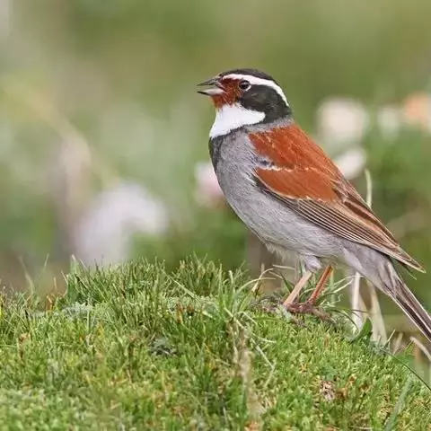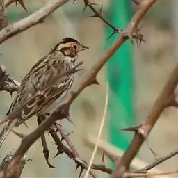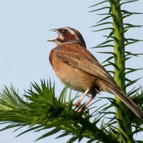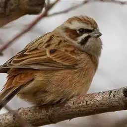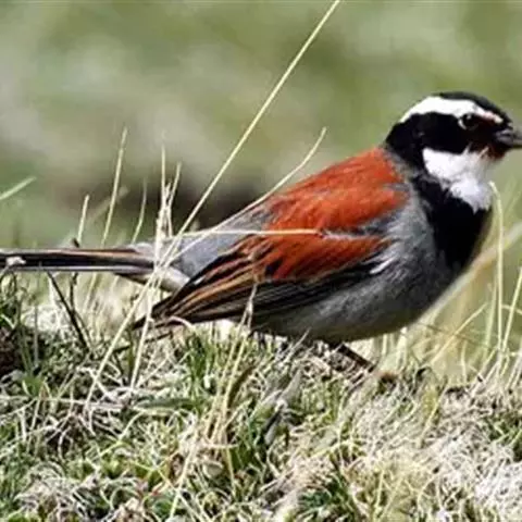 栗斑腹鹀(学名:Emberiza jankowskii):属小型鸣禽。体重19-25克,体长145-167毫米。头顶至背栗红色,眼先和颧纹黑褐色,黑色颧纹上还有一白纹,耳羽褐色或灰褐色,眉纹白色或灰白色。背、肩具黑色纵纹,腰至尾上覆羽砖红色无纵纹,两翅和尾羽黑褐色,两对外侧尾羽具楔状白班。下体污白色或灰白色,腹中央有一明显的心脏形栗色大斑。喙为圆锥形,与雀科的鸟类相比较为细弱,上下喙边缘不紧密切合而微向内弯,因而切合线中略有缝隙;体形和羽色近似三道眉草鹀,唯体色棕栗。