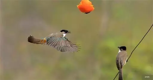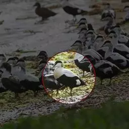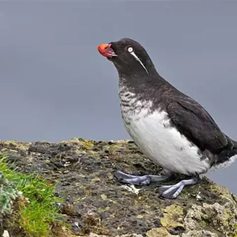 凤头海雀(学名:Aethia cristatella ):体重211-322克,体长18-20厘米,是鸻形目海雀科的一种海鸟,前趾间有蹼膜,后趾缺如。翅窄而短小,尾短。是海鸟中体型相对较小的鸟类。雌雄羽色相似。身体羽毛上体深灰色,下体通常是棕灰色。头顶面部有装饰性的向前卷曲的羽冠,雄鸟鸟喙上有颜色鲜艳的“角质”板,称为鼻板。虹膜白色,头的两侧各有一条白色羽纹,从眼睛后面一直延伸到耳朵。腿灰色,脚上有蹼呈煤黑色。鸟喙亮红橙色,尖端是黄色。