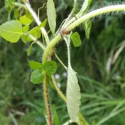 叶卵形,长2-5厘米,宽1.5-3.2厘米,先端钝或急尖,基部阔楔形至几圆形,边缘具疏圆齿状牙齿,上面榄绿色,下面略淡,两面被糙硬毛,尤其是下面脉上,侧脉约5对,与中脉在上面微下陷下面明显隆起。